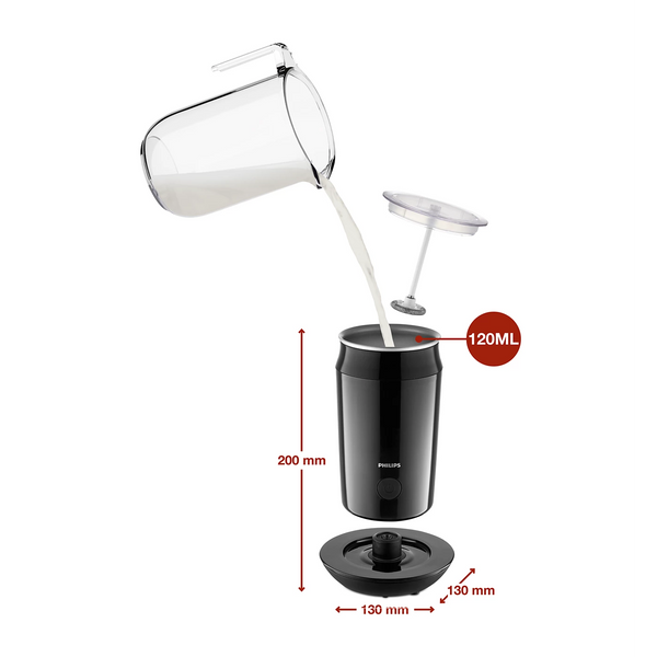 The Philips Milk Frother provides the freedom to enjoy a variety of hot and cold coffee recipes at home. Thanks to its innovative frothing whisker, you can enrich delicious coffee and milk drinks with amazingly velvety smooth milk foam.